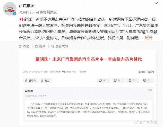 上述对话被部分自媒体截取并演绎为“格力将替代广汽一半汽车芯片”的笃定性配合权术,激发市集臆测。对此,广汽集团在声明中重申,有关言论仅为现场纰漏换取,并不代表已终结任何实验性公约或供应安排。