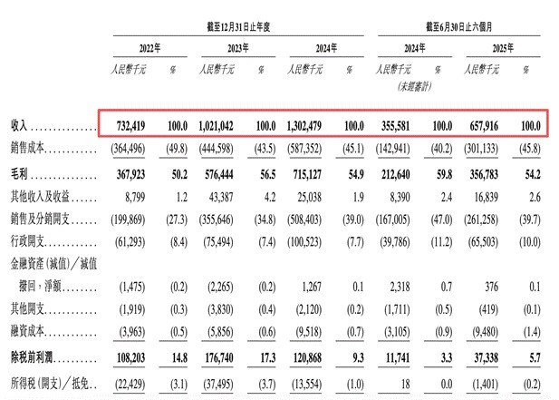 把柄招股书,2022年至2024年,其收入辞别为7.32亿元、10.21亿元、13.02亿元,2025年上半年收入为6.58亿元,同比增长85%。